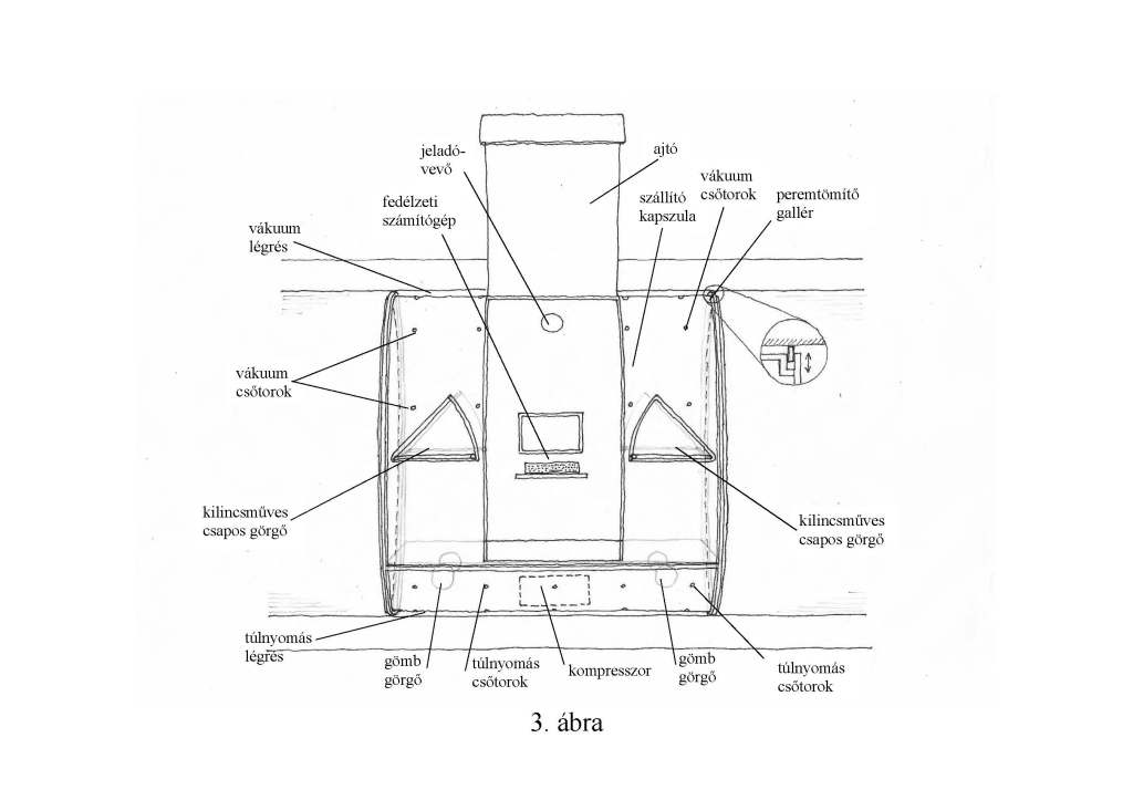 A rendszer elemei A kapszula kialakítása könnyű (pl. üvegszál erősített műgyanta laminálású), szigetelt szendvics héjszerkezettel, kör keresztmetszettel, és egyenes síkú, csőirányra merőleges véglezárásokkal van megoldva, a végoldalak peremén gumi tömítő gallérokkal, hogy a kapszula és a cső közötti résen minél kevesebb levegő tudjon átszivárogni. A légpárnás üzemet a kapszula saját kompresszora üzemelteti, a felső palást felőli elszívással és a kapszula alsó palástja felé befúvással, így csökkentve a súrlódást és biztosítva a csőbeli légáramlattal azonos haladási sebességet. A szívott és nyomott palástmenti légréstek közötti határoló tömítés kialakítása biztosítja, hogy a lebegtető nyomások csak a kapszula palástja körül hassanak, és ne a főáramlás légterébe keveredjenek. Persze ezen rendszer is meghibásodhat, így szükséges a kapszulák minden irányban gördülni képes kerekekkel való felszerelése is, ami a parkolási (javítási) mozgatásokhoz is szükséges és alkalmas. (3. ábra)